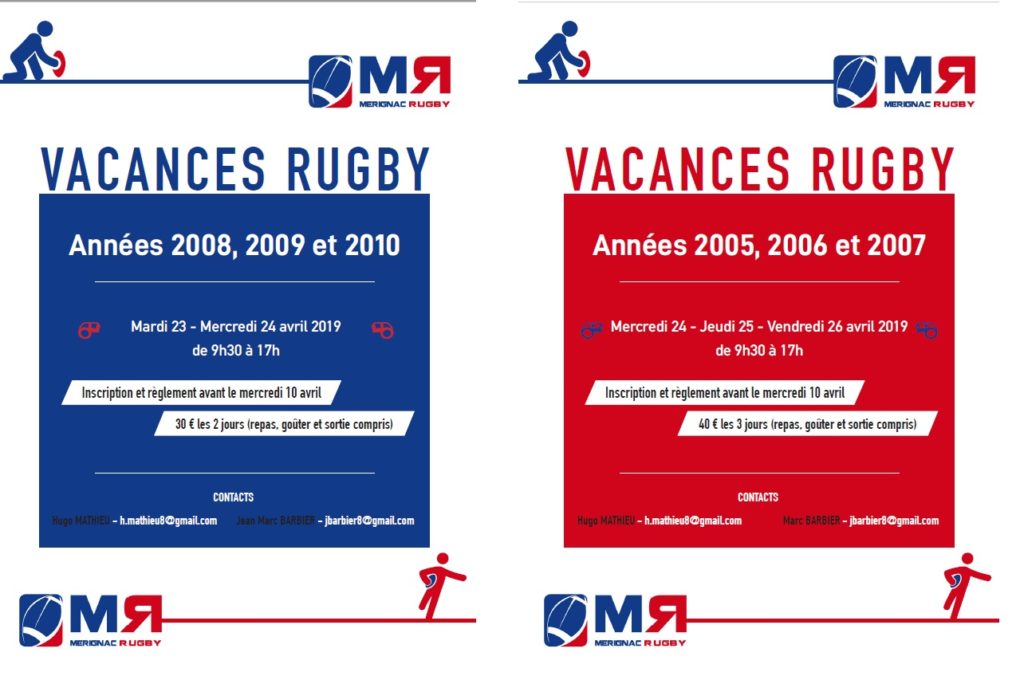 STAGES VACANCES PAQUES Publié le 9 avril 2019 par Communication Mérignac Rugby chez Mérignac Rugby – ASMR . Modifié le 9 avril 2019 Retour