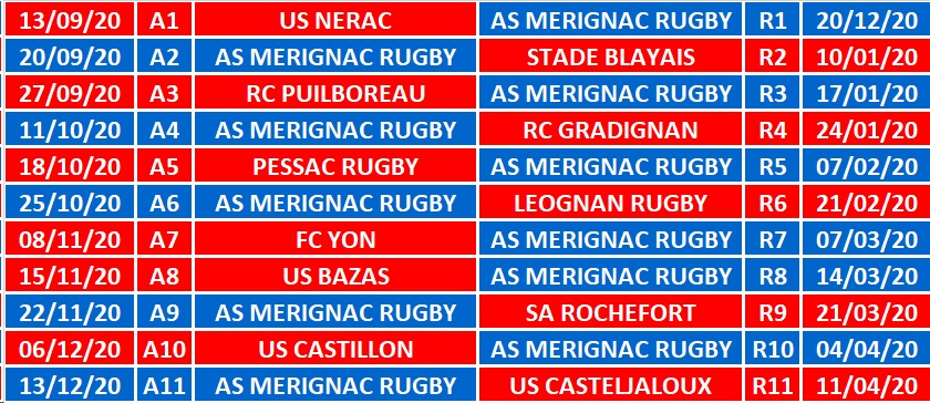 Cà y est, le calendrier vient de sortir. Après une fin de saison terminée avant la fin à cause de la crise sanitaire, replongeons nous dans la nouvelle compétition. La FFR vient d’annoncer les calendrier FEDERALE 3. Nous commencerons donc avec un premier déplacement à Nérac, pour une 1ere réception à Brettes nous aurons un premier derby contre nos collègues du Stade Blayais