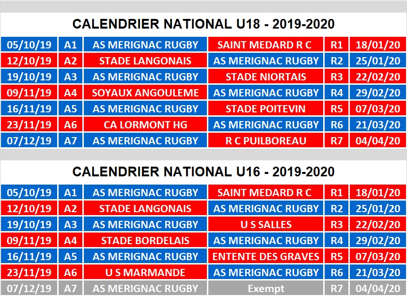 La FFR vient de publier les poules et calendrier des championnats Nationaux U16 et U18. Nos U16 se retrouvent dans une poule « très locale » et solide avec les voisins de St Médard, Stade bordelais, Entente des Graves, Salles, Langon et Marmande. 1ere rencontre avec la réception de St Médard ce samedi.