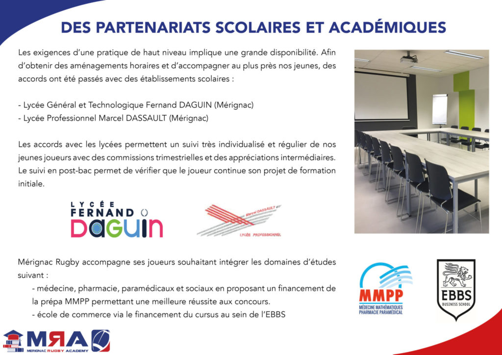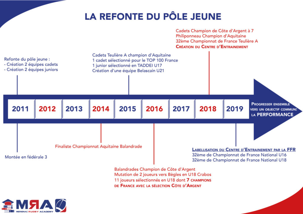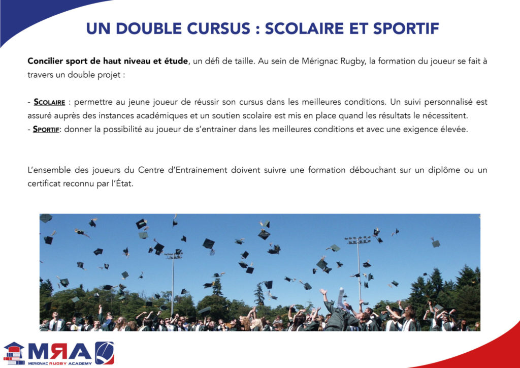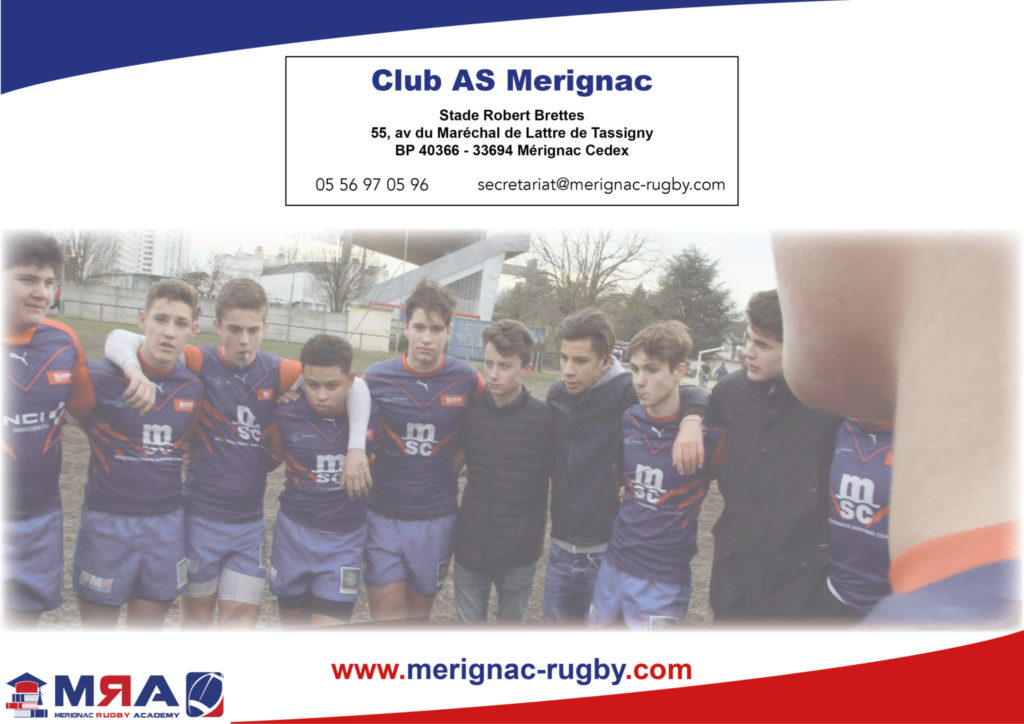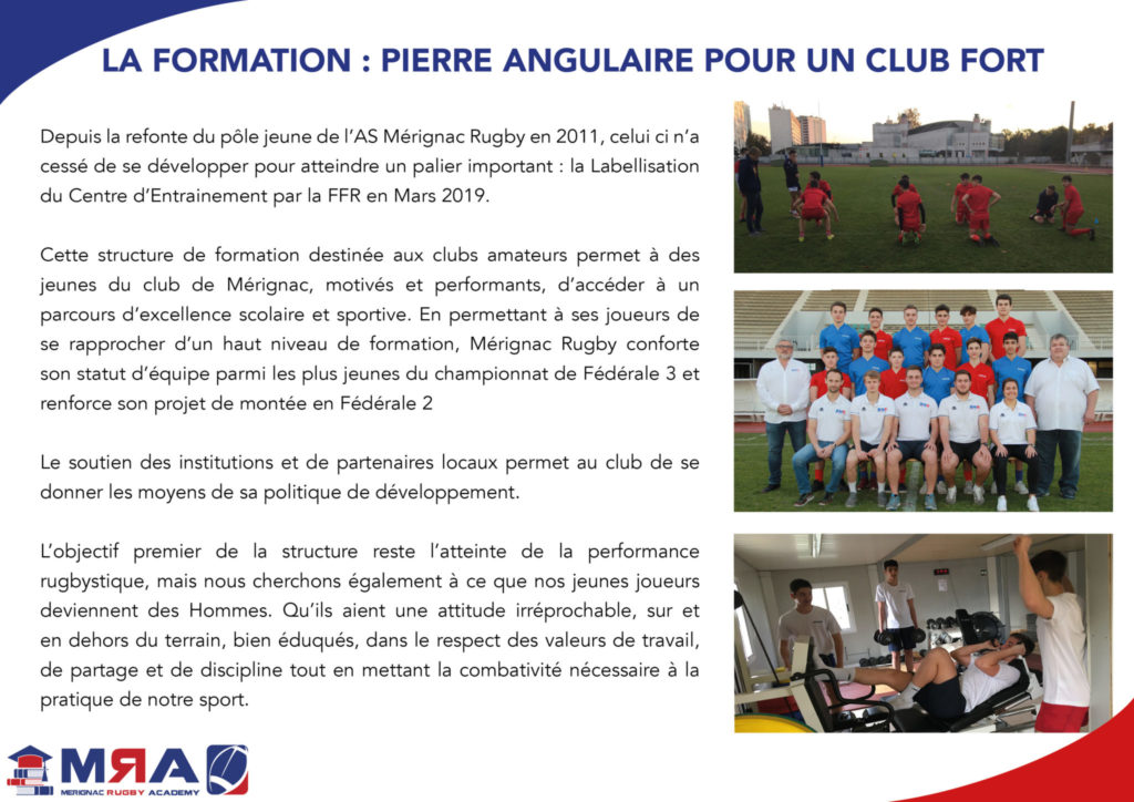Pierre angulaire de la politique de MÉRIGNAC RUGBY, la Formation est un atout et une fierté pour le club. Chaque saison, de jeunes talents sont lancés dans le grand bain de la Fédérale avec une équipe première une de plus jeune du championnat de en Fédérale 3. Certains joueurs signent également dans des équipes jeunes de clubs du secteur professionnel.