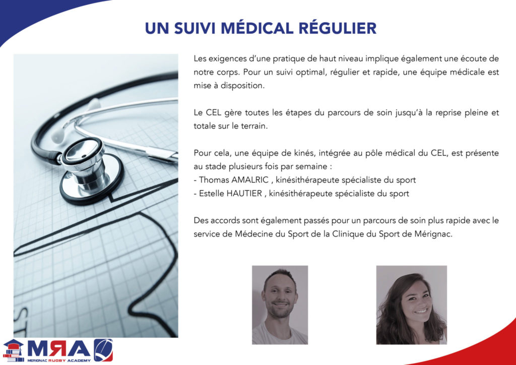 - Le médical : suivi médical et prise en charge des blessures par une équipe médicale. Information sur la diététique, le dopage et l’hygiène de vie.