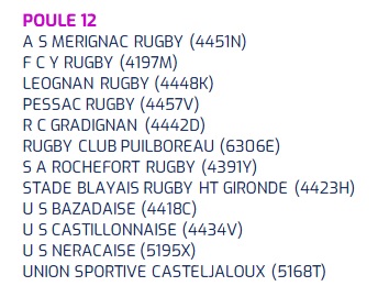 La FFR vient de dévoiler les poules du futur championnat 2020-2021. Nous serons donc en poule 12 avec de vielles connaissances . Cap au Nord avec le FCY, Puilboreau et Rochefort, et à l’est avec Nérac, Casteljaloux. Enfin de beaux derbys girondins avec Blaye, Bazas, Castillon, Pessac, Gradignan et Léognan. La programmation du premier match est prévue le 13 septembre sous condition bien sûr que les conditions sanitaires le permettent.