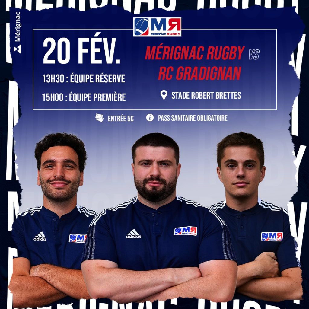 Nos équipes seniors reçoivent les équipes du RC Gradignan ce dimanche 20 février pour la 13ème journée du championnat. Ce prochain match aura lieu au Stade Robert Brettes de Mérignac à 13h30 pour l’équipe d’Excellence B et à 15h00 pour l’équipe de Fédérale 3. Pour la réception de ce nouveau match, nous organisons un repas d’avant match ouvert à tous. Ce repas est l’occasion pour nous de présenter et remercier notre nouveau partenaire maillot qui n’est autre qu’Intermarché. De plus, notre président prendra la parole pour introduire cet événement et réaliser la présentation du partenaire.