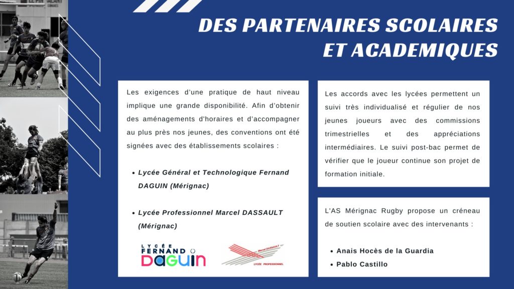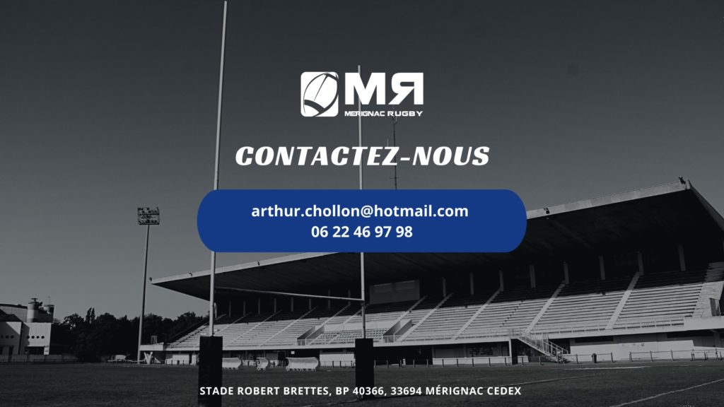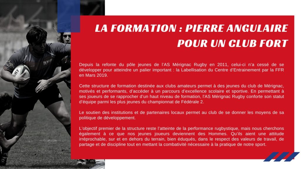 Pierre angulaire de la politique de MÉRIGNAC RUGBY, la Formation est un atout et une fierté pour le club. Chaque saison, de jeunes talents sont lancés dans le grand bain de la Fédérale avec une équipe première une de plus jeune du championnat de en Fédérale 3. Certains joueurs signent également dans des équipes jeunes de clubs du secteur professionnel.