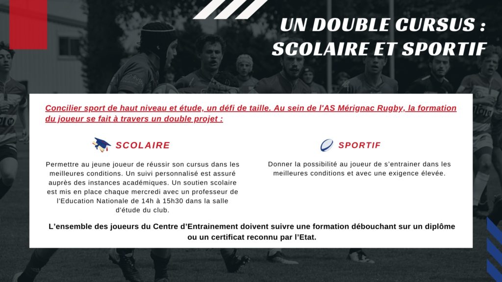 Créé en 2017, le Centre d’Entrainement de MÉRIGNAC RUGBY est une structure de formation ayant pour objectif d’amener les meilleurs joueurs du cru plus rapidement au niveau Fédéral en développant leurs qualités rugbystiques et leurs compétences pédagogiques. Labellisé dès sa deuxième année d’existence en Mars 2019, la structure est reconnue au niveau Fédéral.