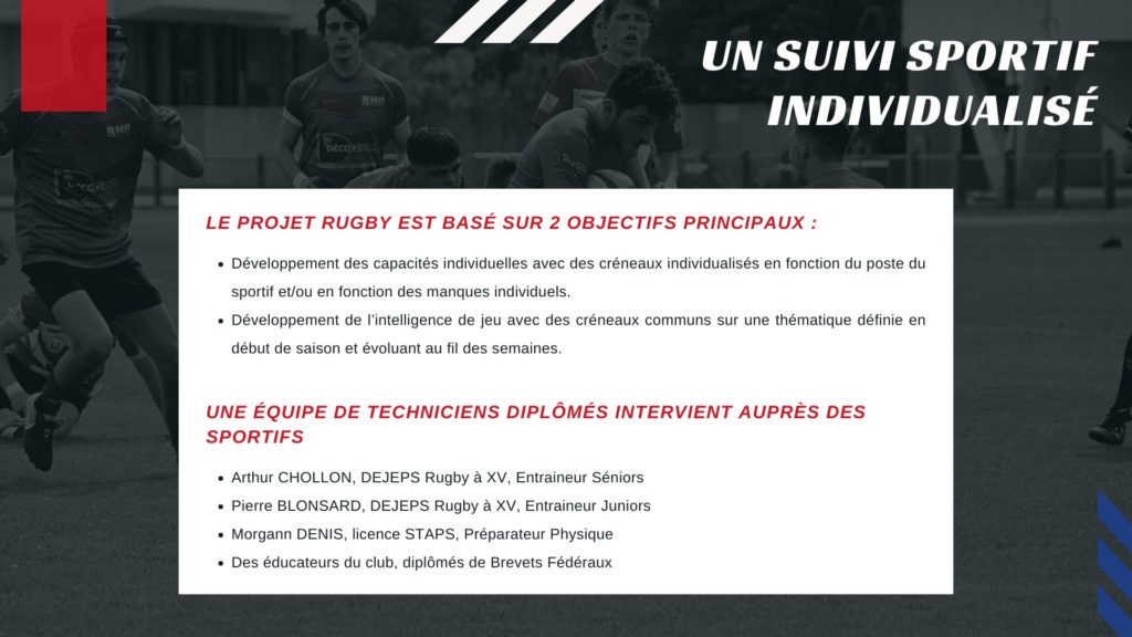 - Le sportif : développement optimisé des compétences rugbystique et physique.