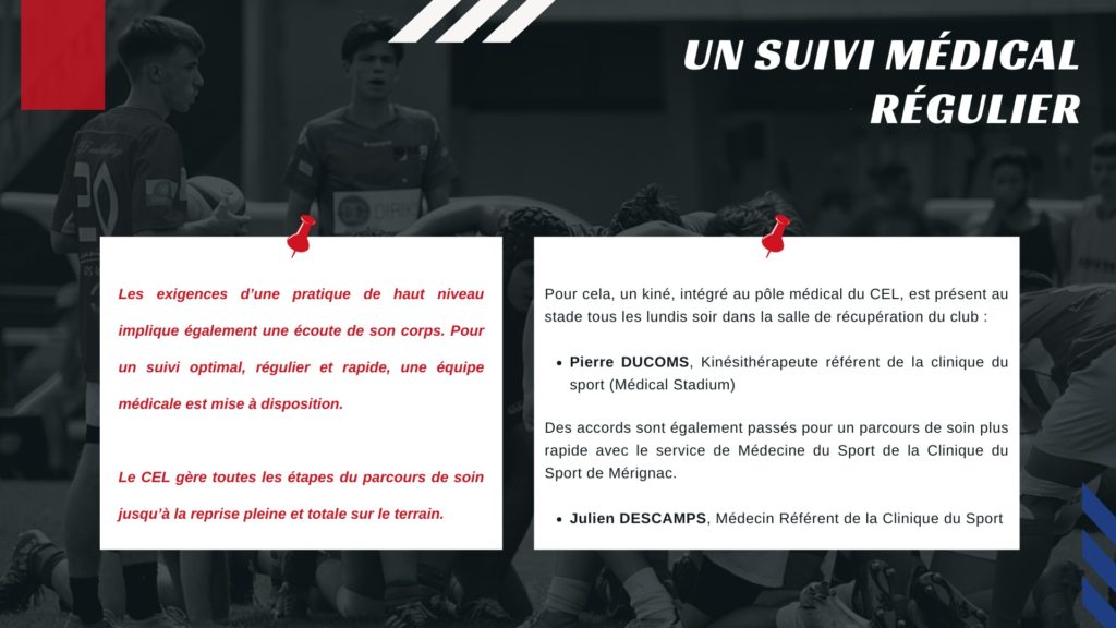 - Le médical : suivi médical et prise en charge des blessures par une équipe médicale. Information sur la diététique, le dopage et l’hygiène de vie.
